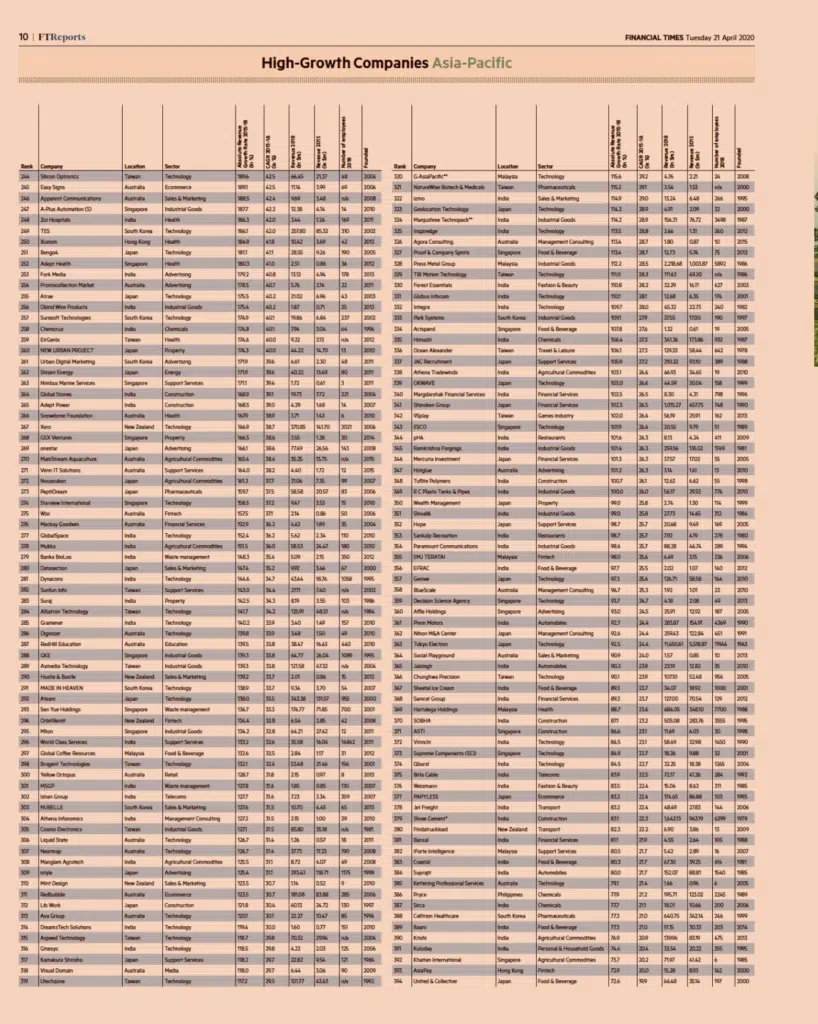 Ranked 295th in Financial Times Asia Pacific High Growth Companies.